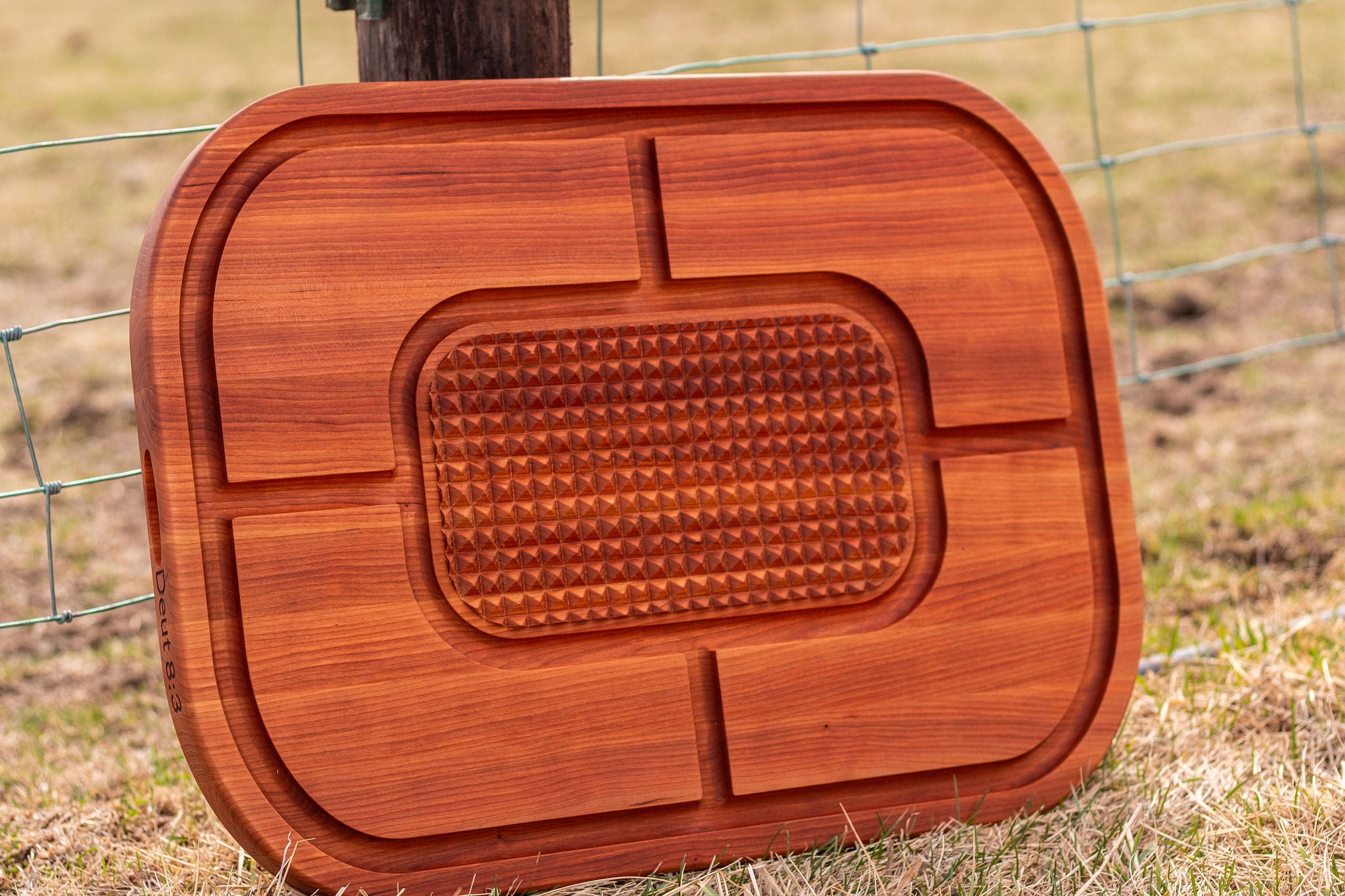 Our board is not just a kitchen tool, but a symbol of faith and tradition. Each end features handle grooves, with a Matthew 4:4 scripture reference on one end and a Deuteronomy 8:3 scripture reference on the other. The Mundorf Heritage Beef logos on the long sides further enhance the board's unique character. This beautifully crafted cutting board is your perfect companion for any major beef prep projects, offering ample space for large or multiple beef cuts and trimmings.