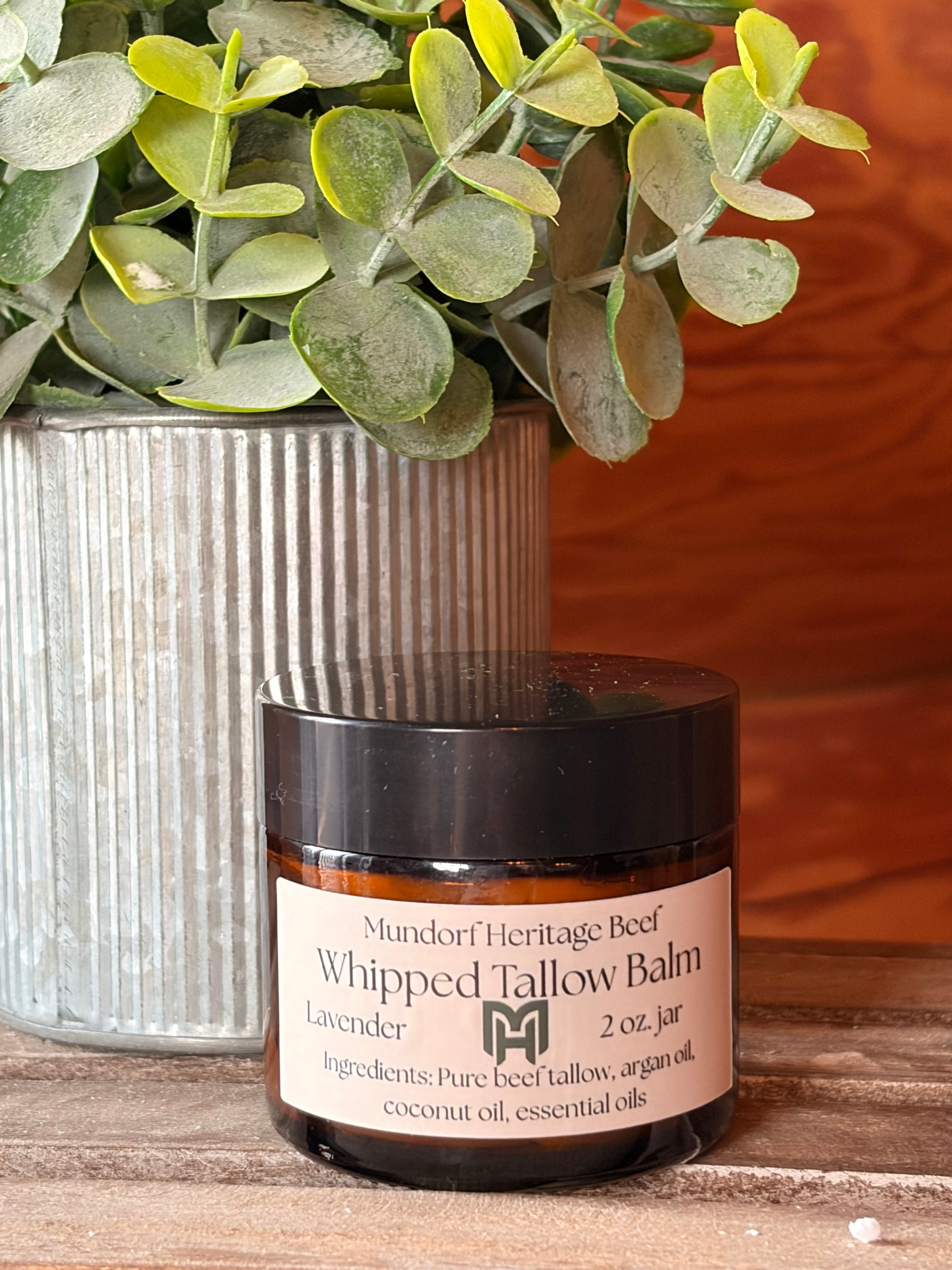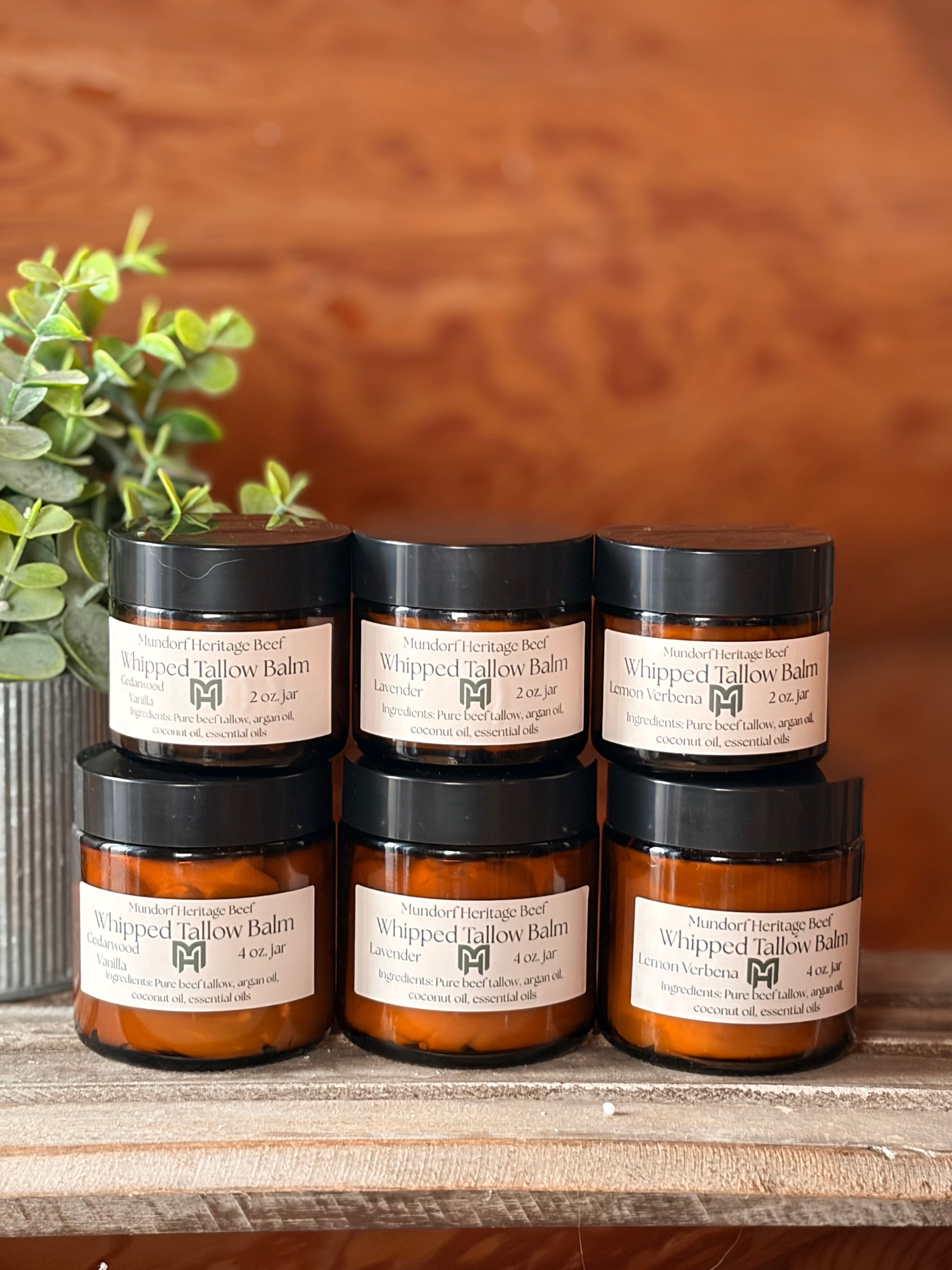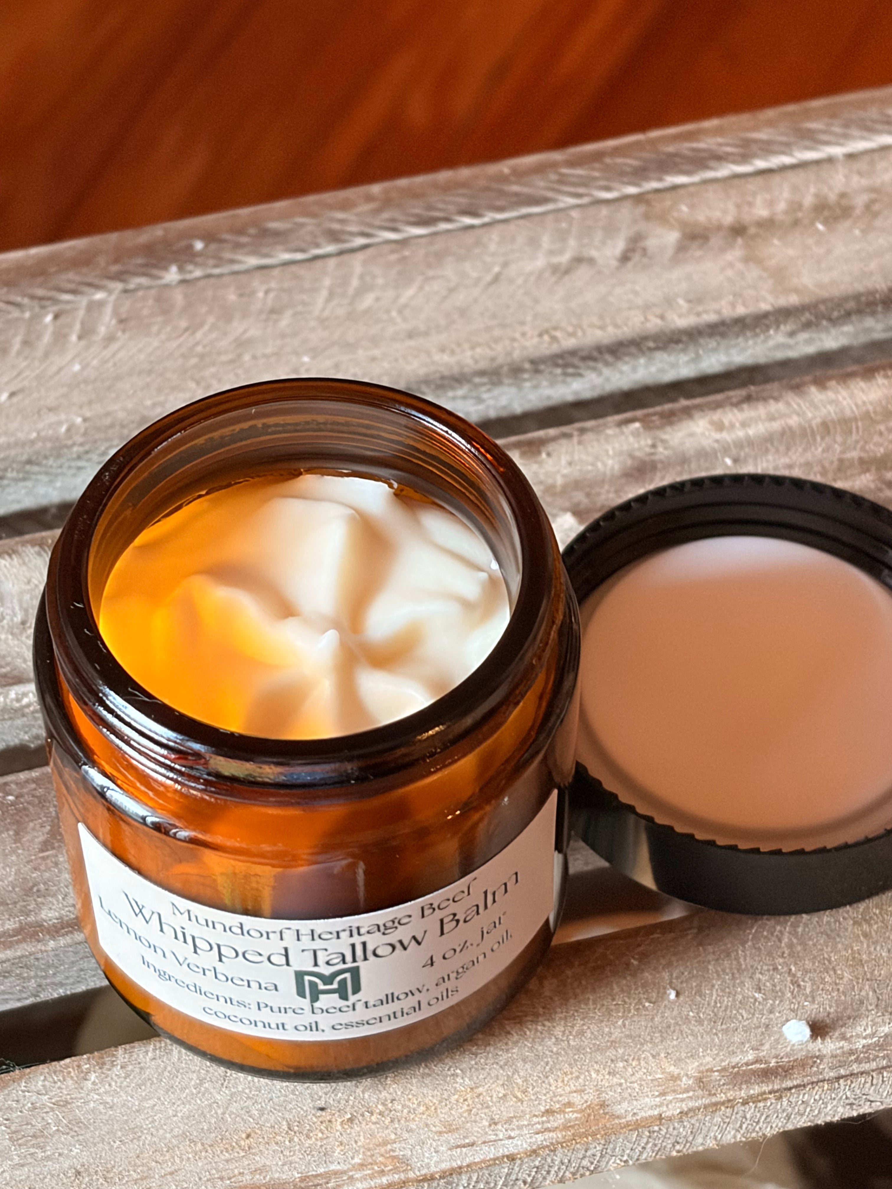 Our Whipped Tallow Balm is a natural, soothing moisturizer made with tallow rendered exclusively from the fat of our premium Angus beef. It is softened with pure argan oil that provides a smooth texture and healing for your skin. A small amount of coconut oil to support hydration and soothing. Essential oils are added for a pleasing scent.